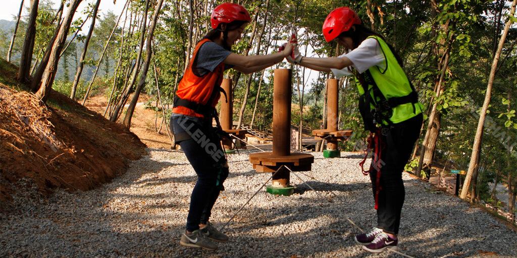 챌린지 로우 코스는 팀워크 향상을 주된 목표로 설계된 특별한 챌린지 코스 프로그램입니다. 이 코스는 참가자들에게 신체적, 정신적, 그리고 사회적인 다양한 형태의 도전을 제공하며, 팀원들 간의 협력과 단결심을 자연스럽게 유도하여 팀워크 증진에 크게 기여합니다. 이를 통해 참가자들은 공동의 목표를 달성하는 과정에서 서로를 이해하고 신뢰를 쌓는 경험을 하게 됩니다.