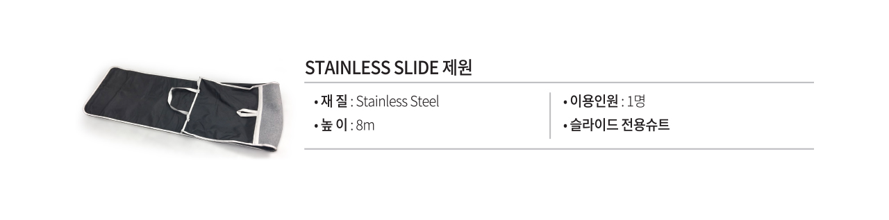 스테인레스 슬라이드는 약 8m 높이에서 시작하여 짜릿하고 스릴 넘치는 속도감을 선사하는 고품격 슬라이드 시설입니다. 이용객들은 빠른 속도로 활강하며 일상에서 벗어난 특별한 스릴과 즐거움을 동시에 경험할 수 있습니다. 경사진 트랙을 따라 내려오는 동안 느끼는 중력 가속감은 마치 하늘을 나는 듯한 자유로운 기분을 선사하며, 모험을 즐기는 이들에게 잊지 못할 추억을 안겨줍니다.