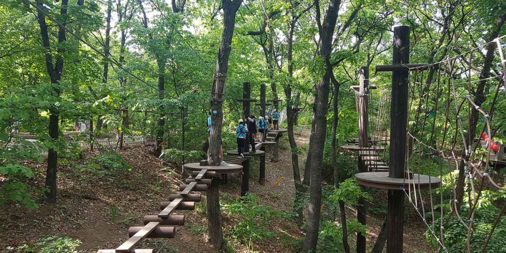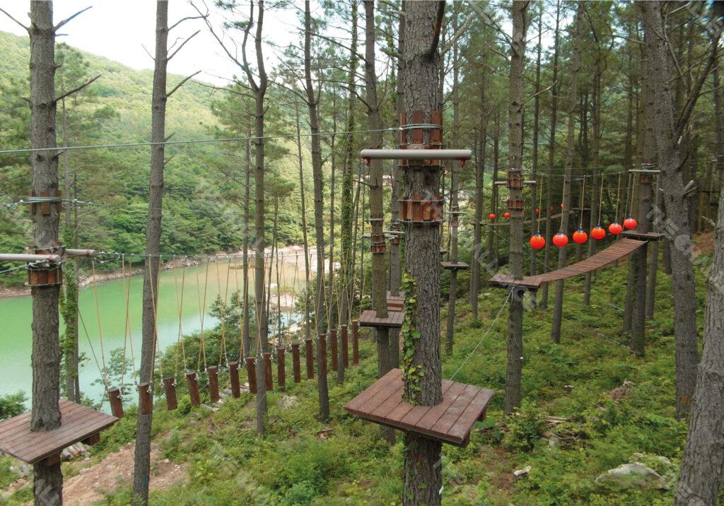 또한 산세의 굴곡과 숲의 지형을 그대로 살려 설계되는 짚라인과 짚코스터는 마치 산새가 되어 숲 위를 비행하는 듯한 압도적인 자유로움을 선사합니다. 이 과정에서 발생하는 시설의 설치 면적은 출발지와 도착지, 그리고 필수적인 중간 지주대로만 국한되어 생태계 파괴를 최소화합니다. 거대한 챌린지 타워나 어드벤처 타워 역시 주변 목재의 색상과 질감을 닮은 친환경 소재와 디자인을 차용하여 이질감 없이 숲의 일부로 동화되도록 기획되고 있습니다.