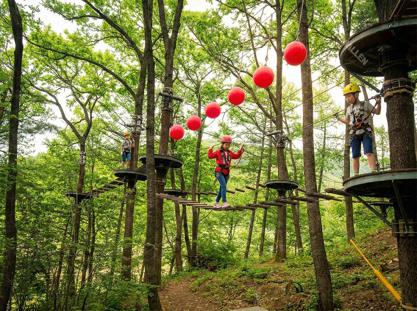 또한 산세의 굴곡과 숲의 지형을 그대로 살려 설계되는 짚라인과 짚코스터는 마치 산새가 되어 숲 위를 비행하는 듯한 압도적인 자유로움을 선사합니다. 이 과정에서 발생하는 시설의 설치 면적은 출발지와 도착지, 그리고 필수적인 중간 지주대로만 국한되어 생태계 파괴를 최소화합니다. 거대한 챌린지 타워나 어드벤처 타워 역시 주변 목재의 색상과 질감을 닮은 친환경 소재와 디자인을 차용하여 이질감 없이 숲의 일부로 동화되도록 기획되고 있습니다.