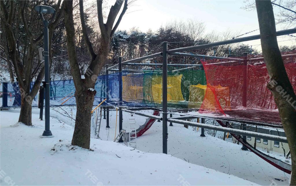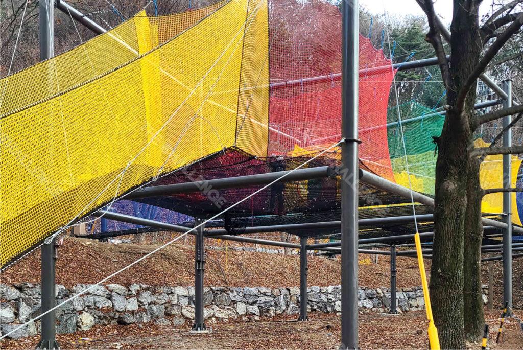 이 시설의 가장 큰 특징은 거대한 나무들 사이에 설치된 그물망 형태의 놀이 공간이라는 점입니다. 기존의 짚라인이나 로프 코스와 달리, 별도의 안전 장비를 착용하지 않아도 안전하게 자유로운 활동을 즐길 수 있다는 점이 가장 큰 차이점입니다. 방문객들은 공중 5m 높이에 설치된 거대한 그물 위를 걷고 뛰며, 마치 하늘을 나는 듯한 색다른 경험을 할 수 있습니다. 공중네트 시설은 3개의 돔 형태 공간과 이들을 연결하는 통로로 구성되어 있으며, 각 공간에는 미끄럼틀, 볼풀 등 다양한 놀이 요소가 접목되어 아이들에게 특히 인기가 높습니다.