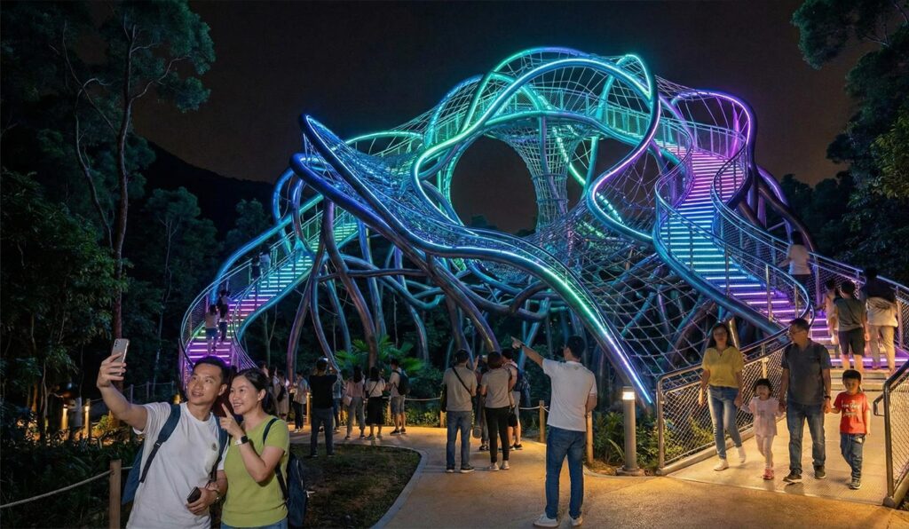다른 시설물과의 가장 큰 차이점은 기능성을 넘어선 심미적 가치에 있습니다. 시설 자체가 하나의 거대한 야외 설치 미술 작품(Art Installation)으로 기능합니다. 관광지로서의 특이점은 이용객뿐만 아니라 이용하지 않고 바라보는 관람객에게도 시각적 즐거움을 선사한다는 점입니다. 숲속에 설치된 거대한 AI 디자인 네트 챌린지는 낮에는 햇살을 받아 반짝이는 신비로운 구조물처럼, 밤에는 경관 조명을 받아 살아있는 생명체처럼 보입니다. 이는 방문객들에게 다른 곳에서는 볼 수 없는 강력한 포토 스팟을 제공하며, SNS를 통해 순식간에 지역의 핫플레이스로 등극하게 만드는 핵심 요인이 됩니다.