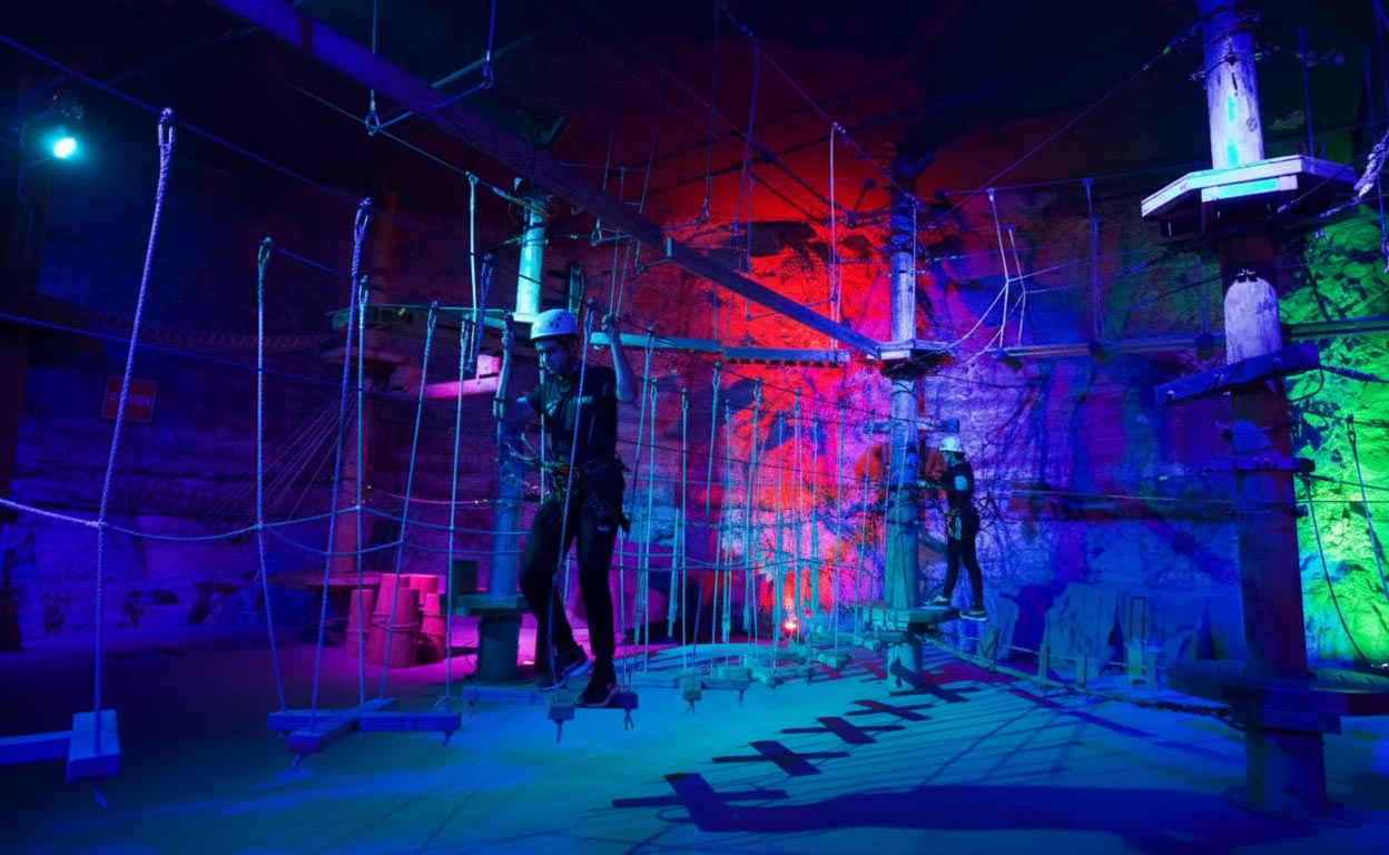 이곳의 대표적인 어드벤처 시설은 단연 ‘메가 퀘스트’와 ‘메가 짚’이다. ‘메가 퀘스트’는 지하 동굴의 천장을 활용한 ‘로프 코스’다. 공중 다리, 흔들리는 통나무, 타이어 등 76개의 다양한 챌린지 요소들이 미로처럼 얽혀 있어 도전 정신을 자극한다. 지상 15m 높이에서 진행되는 코스는 안전 장비를 착용하므로 누구나 안심하고 스릴을 즐길 수 있다.