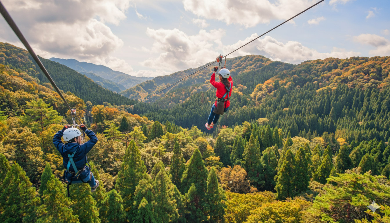 후쿠이현 남동부에 위치한 이케다초는 일본에서도 손꼽히는 삼림 지역입니다. 이곳의 울창한 숲을 활용하여 탄생한 이케다산 트리 피크닉 어드벤처(Tree Picnic Adventure IKEDA)는 자연 속에서 스릴과 모험을 만끽할 수 있는 일본 최대 규모의 어드벤처 시설입니다. 이 시설의 핵심은 바로 ‘메가 짚라인’입니다. 약 1km에 달하는 와이어 케이블을 타고 숲 위를 활공하며, 마치 새가 된 듯한 기분으로 웅장한 자연 경관을 감상할 수 있습니다.